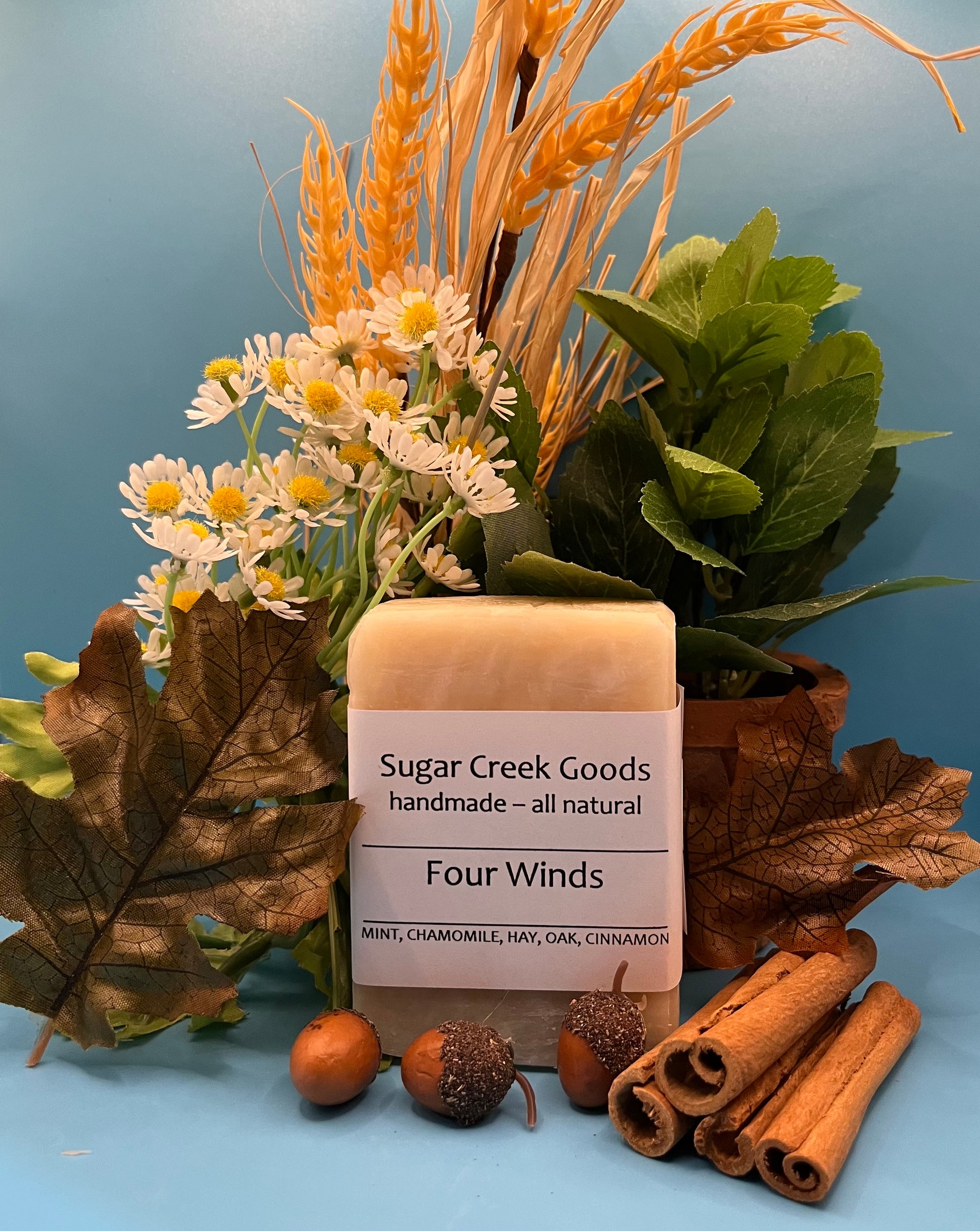 Ingredients: Saponified Oils of Lard, Olive, Coconut, Castor, Shea Butter, Cocoa Butter, Mint, Chamomile, Hay, Oak, and Cinnamon Fragrance