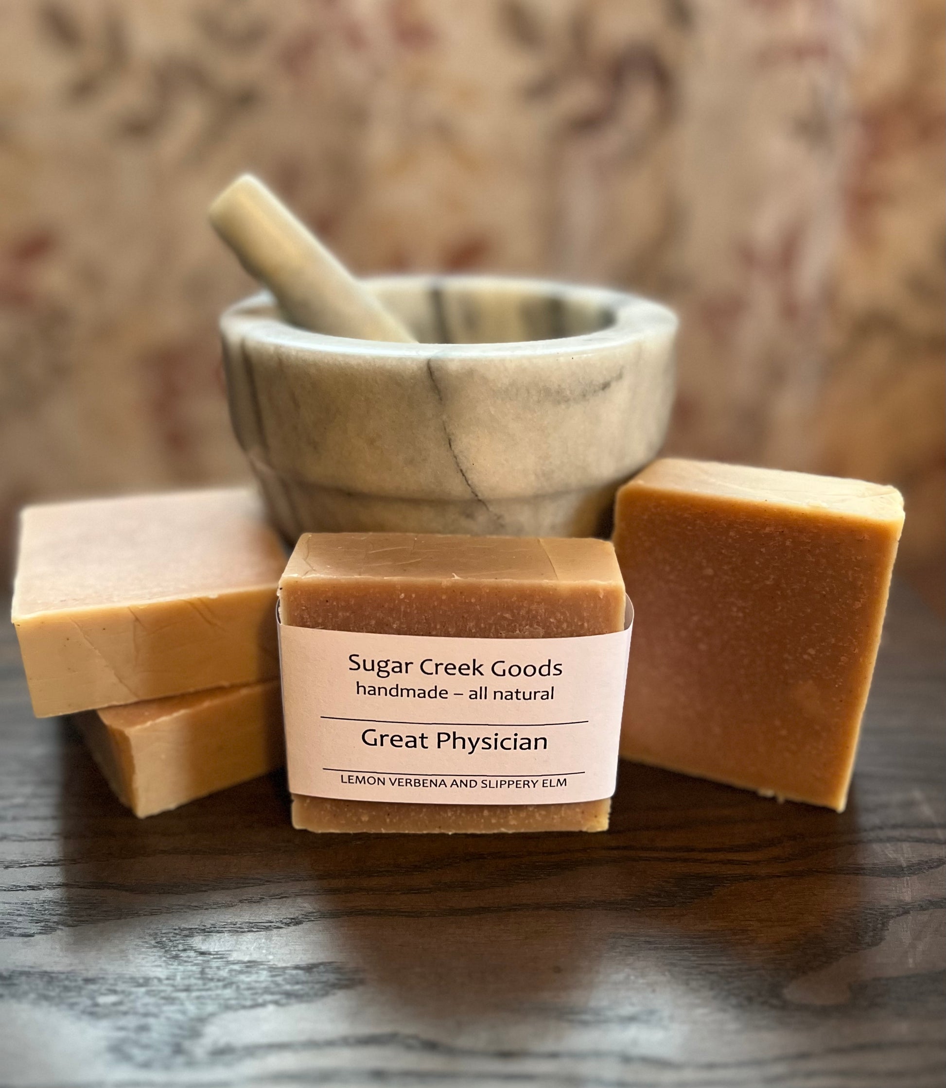 Ingredients: Saponified Oils of Lard, Olive, Coconut, Castor, Shea Butter, Cocoa Butter, Lemon Verbena Fragrance, Slippery Elm Bark Powder