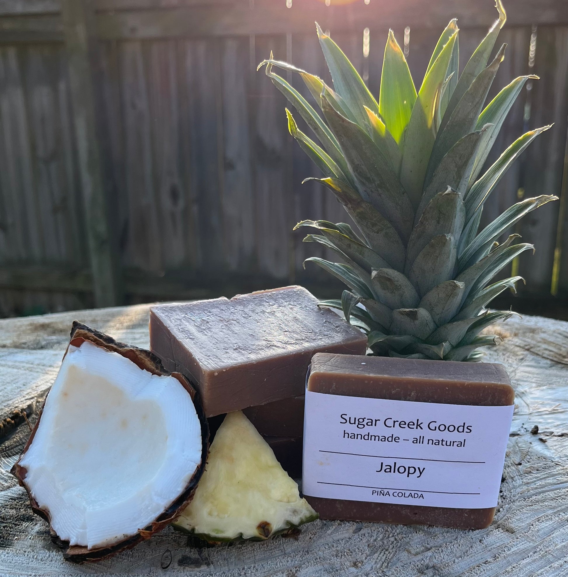 Ingredients: Saponified Oils of Lard, Olive, Coconut, Castor, Shea Butter, Cocoa Butter, Pineapple and Coconut Fragrance
