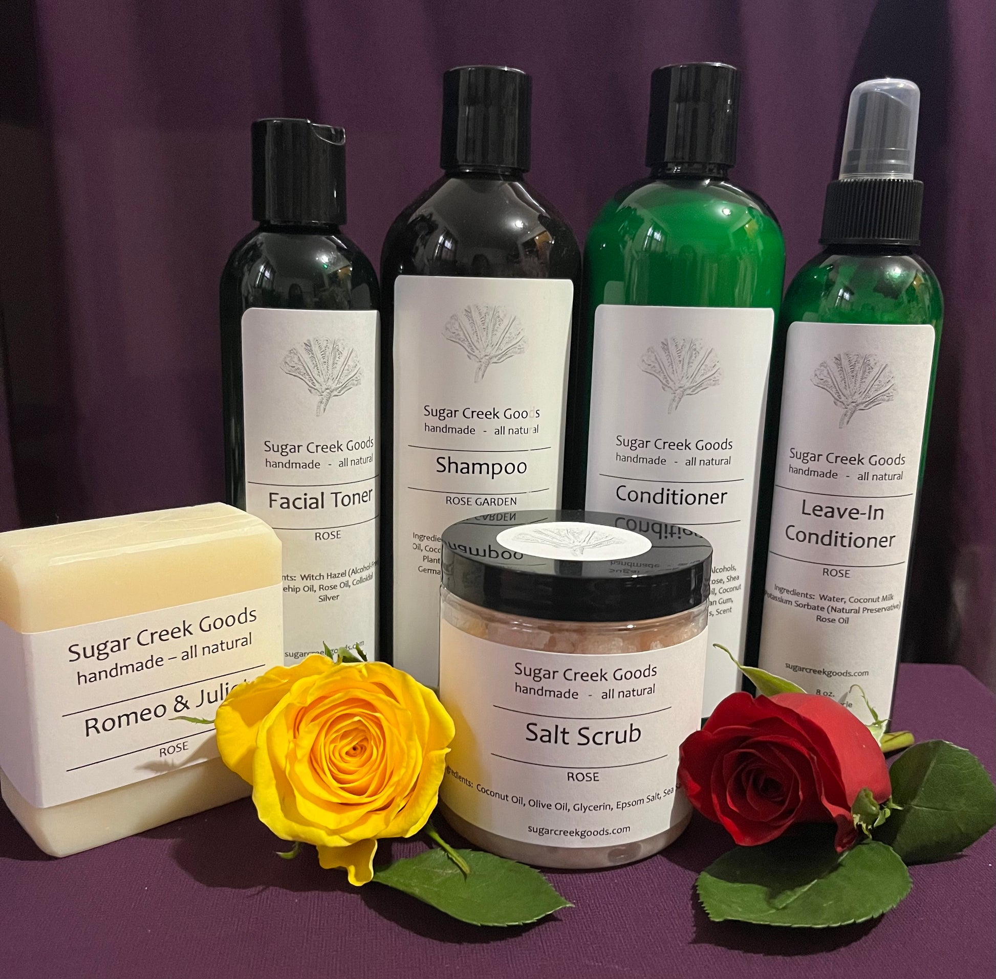 One each of Romeo & Juliet, Rose Salt Scrub, Rose Facial Toner, Rose Leave-In Conditioner, Rose Garden Shampoo, and Rose Conditioner
