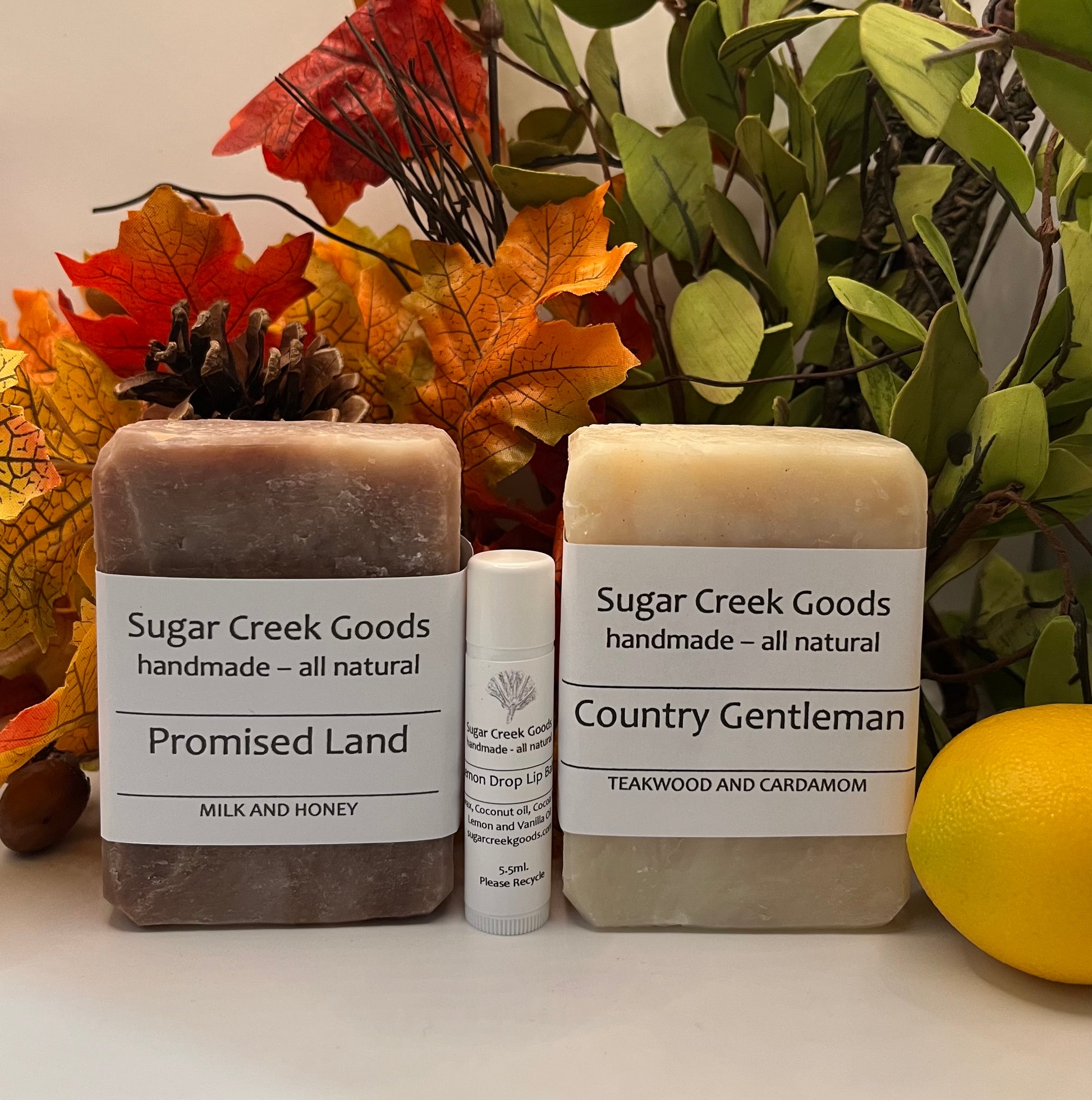 One each of Promised Land and Country Gentleman Bar Soap, and Lemon Drop Lip Balm